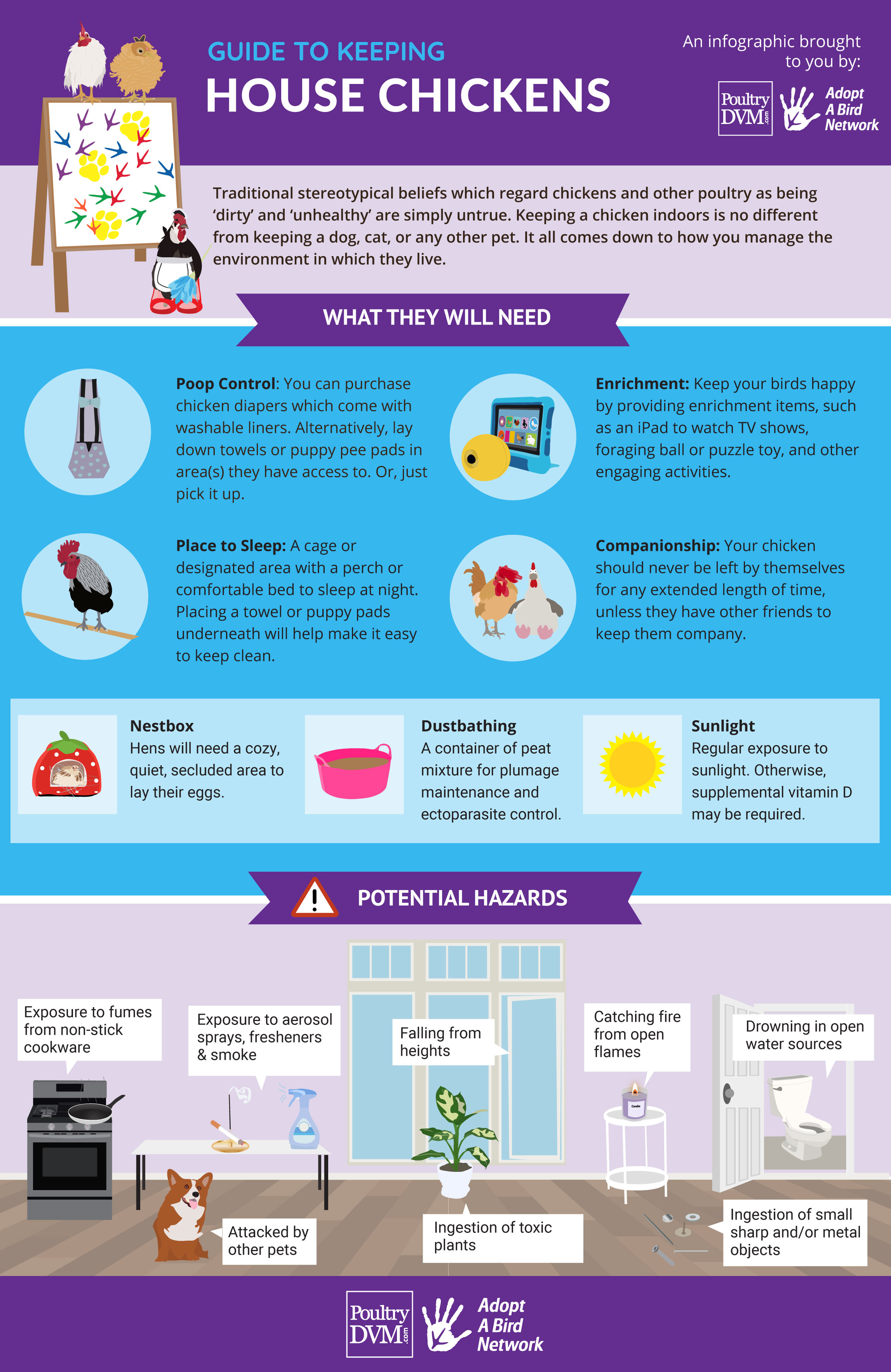 House chickens (chickens who live inside your home with you) are becoming increasingly popular worldwide. Chickens may become house pets when they have a disability or other disadvantage which inhibits them from thriving in a typical flock environment, when they are recovering from an illness or injury, or when you find yourself needing more companionship (chickens make excellent companions!).